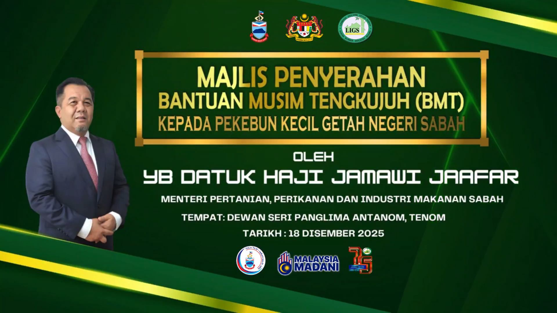 Majlis tersebut telah disempurnakan oleh YB Datuk Haji Jamawi Jaafar, Menteri Pertanian, Perikanan dan Industri Makanan Sabah. Seramai 150 orang pekebun kecil getah di daerah Tenom menerima manfaat menerusi Majlis Penyerahan Bantuan Musin Tengkujuh (BMT) 2025.